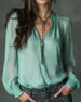 Button-Down V-Neck Puff Sleeve Blouse
