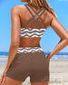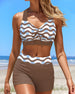 SPECIFICATIONS Style: Vacation Material: 15% Spandex,85% Polyester Occasion: Vacation Neckline: V neck_V Pattern Type: Striped,Color Block,Print Sleeve Length: Sleeveless Top Type: Bikini Bra Type: Wireless Bra Bottom Type: Shorts Fit Type: Skinny Details: Backless,Cross Straps Package Includes: 1 x Bikini SIZE TABLE Size Bust Waist Hip Unde...